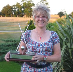 Ellie Brown (pictured below) had a sizzling round to win the PIAB Trophy after 12 years of trying.  This was her second win of the season, after winning the Twilight Stableford in June in windy and cold conditions.  The wind was still a factor in Saturday’s stunning victory, but the weather was extremely hot – just like her 44 point round.  This meant a reduction of 4 strokes off her handicap and she will now play off 28.